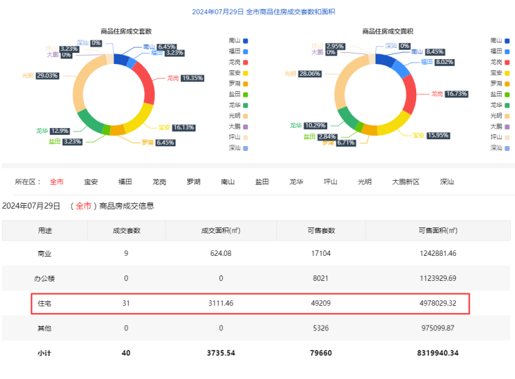 2024年7月29日新房住宅共网签31套。宝安5套;福田1套;龙岗6套;罗湖2套;南山2套;盐田1套;龙华4套;坪山1套;光明9套;大鹏0套;深汕0套。