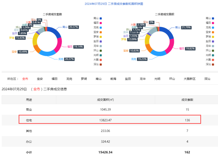 2024年7月29日二手房住宅网签136套。宝安16套;福田27套;龙岗28套;罗湖17套;南山29套;盐田1套;龙华12套;光明0套;坪山2套;大鹏4套。