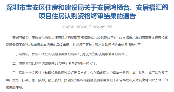 9月27日,深圳市宝安区住房和建设局公示安居鸿栖台、安居福汇阁项目住房认购资格终审结果,终审合格认购申请家庭共3573户,并已经公示摇号结果。