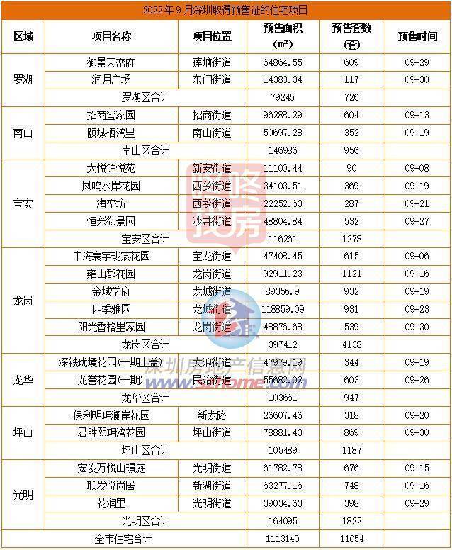2022年9月,深圳20个项目取得住宅预售许可证,合计预售11054套新房住宅,其中龙岗区预售397412平方米/4138套,是9月份住宅预售量较大的区域。