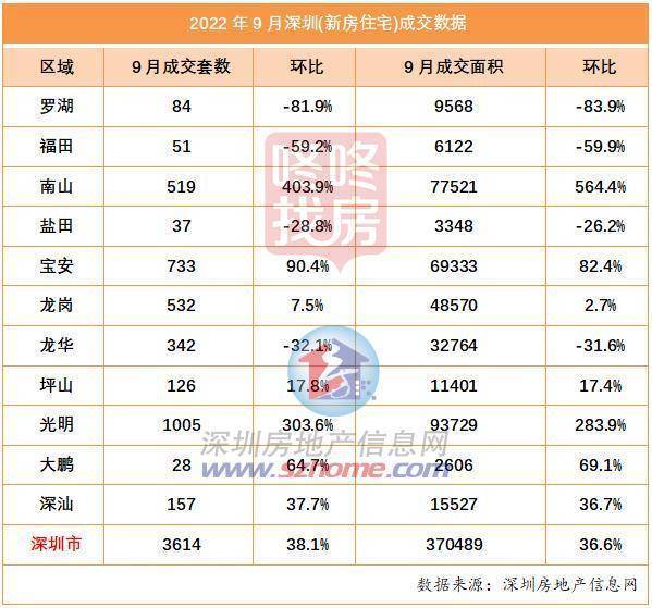统计数据显示:2022年9月深圳成交3614套新房住宅,环比增加38.1%;成交面积370489平方米,环比增加36.6%。宝安、光明是全市的主力成交区域。