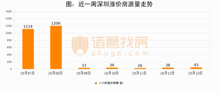 根据诸葛找房数据显示,深圳24小时涨价房源量为43套,较10月12日增加5套,环比上涨13.2%。与此同时,涨价房源占比小幅扩大,业主信心有所提升。