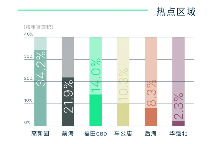 科技企业快速发展刺激过渡期办公需求的增加,再加上疫情后市场对于灵活办公的接受度逐步提高,推动共享办公空间重返优质写字楼市场并出现一定的扩张势头。新增供应压力下,政府招商助力个别楼宇快速去化的效果显著。前海板块年内表现尤为突出,前海的空置率在下半年录得超20个百分点的下降至25.7%,片区的租金也因此实现微增。
