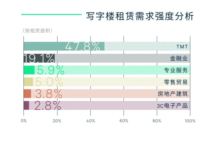 此外,疫情后出现的“芯片荒”及出境购物受阻催生了写字楼市场的新需求,包括电子元器件的零售贸易及跨境电商等需求占比达到2.8%。