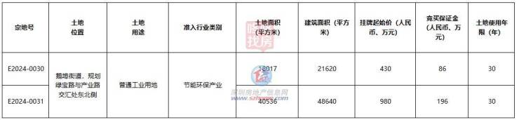 宗地号E2024-0030,土地面积18017平方米,建筑面积21620平方米,挂牌起始价430万元,土地使用年限30年;宗地号E2024-0031,土地面积40536平方米,建筑面积48640平方米,挂牌起始价980万元,土地使用年限30年。