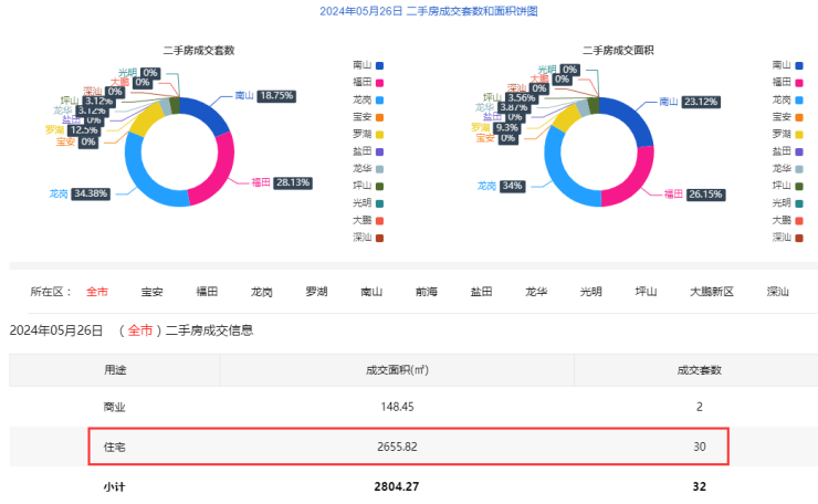 2024年5月26日二手房住宅网签30套。宝安0套;福田9套;龙岗9套;罗湖4套;南山6套;盐田0套;龙华1套;光明0套;坪山1套;大鹏0套。