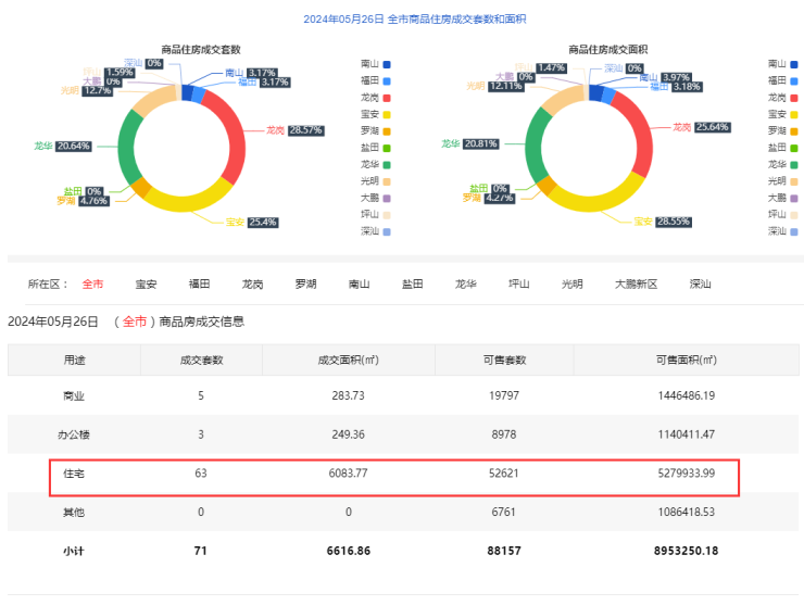 2024年5月26日新房住宅共网签63套。宝安16套;福田2套;龙岗 18套;罗湖3套;南山2套;盐田2套;龙华13套;坪山1套;光明8套;大鹏0套;深汕1套。