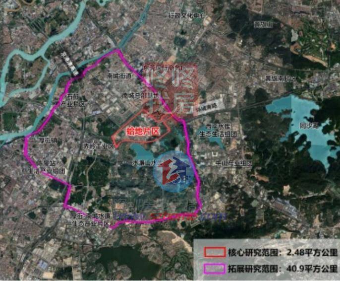 根据规划,本次核心研究范围:以枢纽站点为中心,对联系最为紧密的功能空间进行重点规划设计研究 ,范围面积约2.48平方公里,涉及南城蛤地片区。