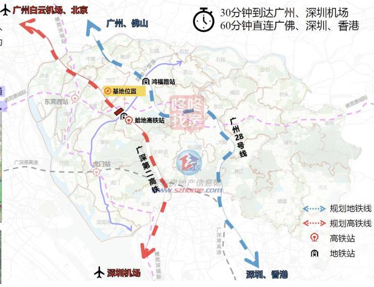 同时利用广州28号线,实现与深圳、广州中心区、香港、佛山的直通直连,借助轨道2号线鸿福路站实现无缝换乘。