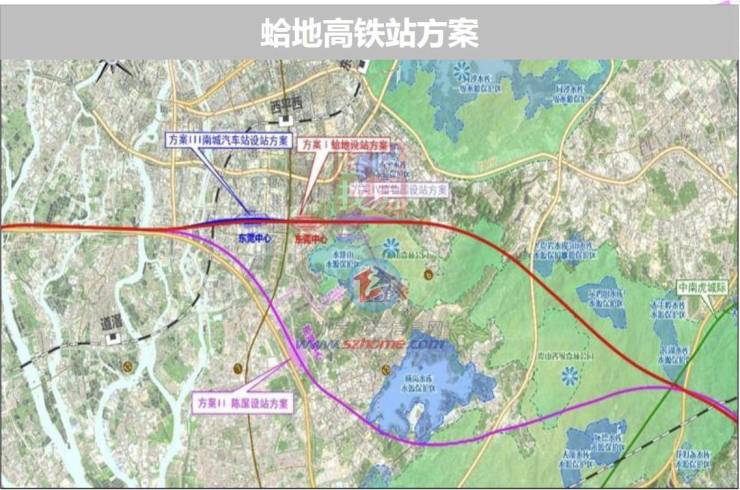 今年5月份,东莞市南城街道办事处发布《关于公开征集南城总部基地片区道路改造工程实施意见的公告》,在公布的附件《总部基地片区交通与空间环境综合改善方案》中,曝光了蛤地高铁站选址4大方案。