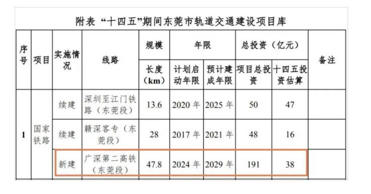 根据《东莞市轨道交通发展“十四五”规划》显示,广深第二高铁(东莞段)长度47.8千米,总投资191亿元,预计2024年动工,2029年竣工。