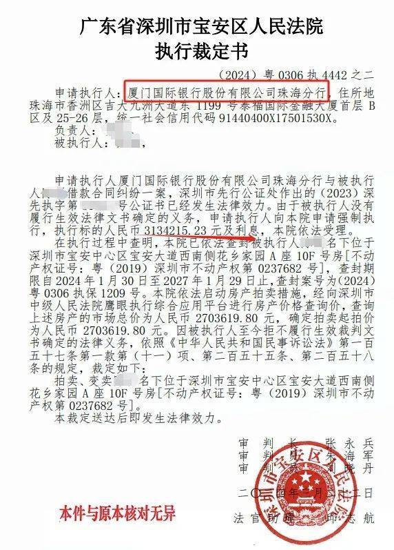 涉案房产显示,2021年9月14日已抵押给了执行人厦门国际银行股份有限公司珠海分行,而后或因无力偿还债务,房子只能被法拍。
