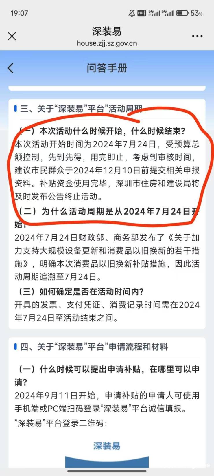 奥一新闻记者检索发现,为推动家装消费品以旧换新、促进家庭装修消费、提升住宅小区居住品质,深圳市2024年推出家装补贴政策,包含全屋装修补贴、住宅局部装修改造补贴、零星装修改造补贴三项,明确采用“先到先得,用完即止”的规则,活动周期为2024年7月24日至2024年12月31日。