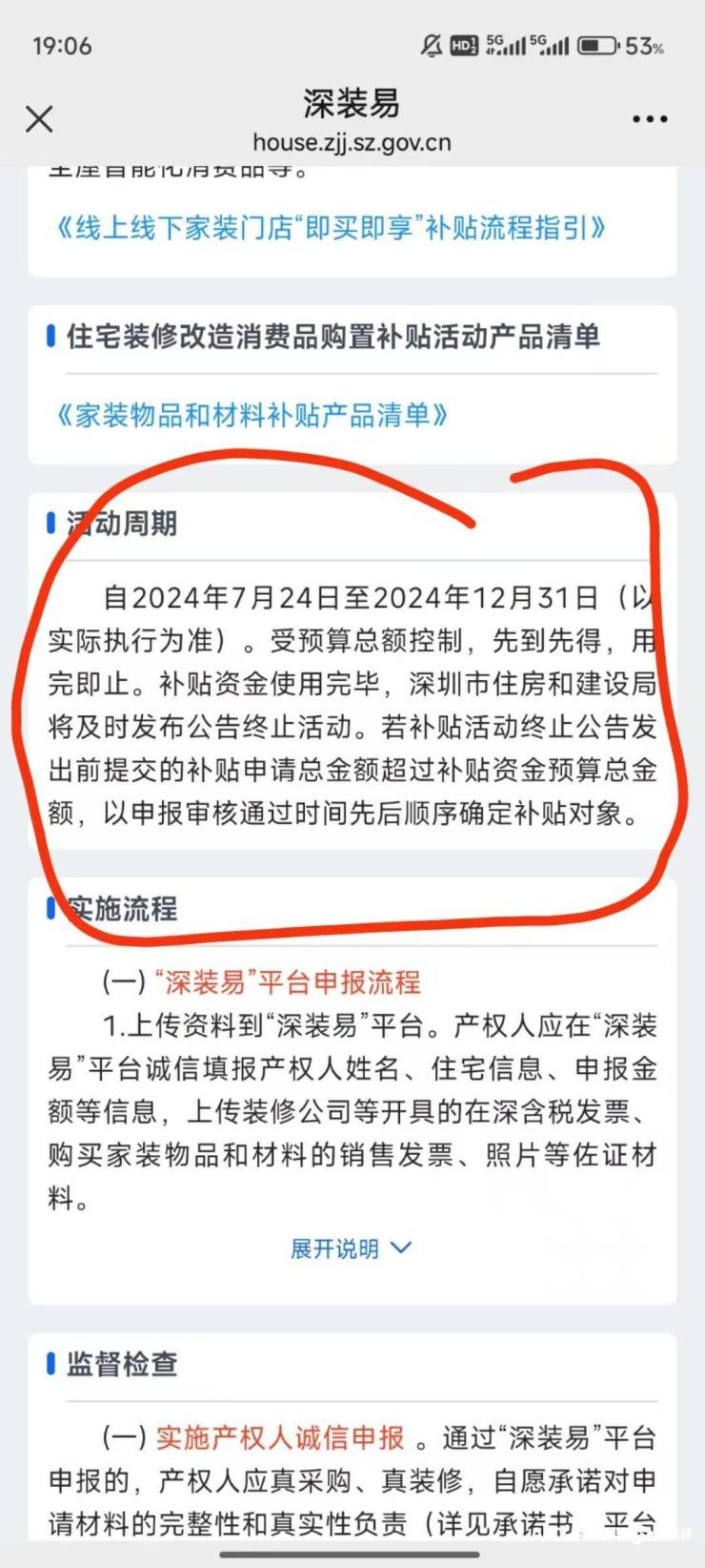 奥一新闻记者注意到,根据深圳市住房和建设局发布的《深圳市住宅装修改造物品和材料购置补贴活动实施指引》,其中提到,若补贴资金使用完毕,深圳市住房建设局将及时发布公告终止活动。若补贴活动终止公告发出前提交的补贴申请总金额超过补贴资金预算总金额,以申报审核通过时间先后顺序确定补贴对象。