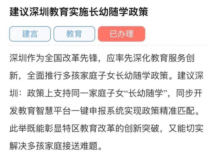该市民表示,建议深圳全面推行多孩家庭子女长幼随学政策,在政策上支持同一家庭子女“长幼随学”,同步开发教育智慧平台一键申报系统实现政策精准匹配。