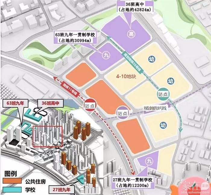 在教育方面,该片区内将有2所63班九年制学校、2所27班九年制学校以及2所36班高中。