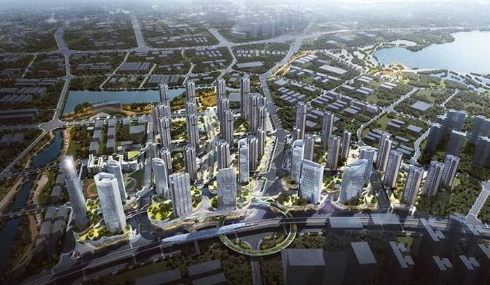从效果图看,整体设计很不错的样子,项目总共有40多栋建筑,通过空中绿道连接11号线塘尾地铁站,与华强城的商业串连成片。