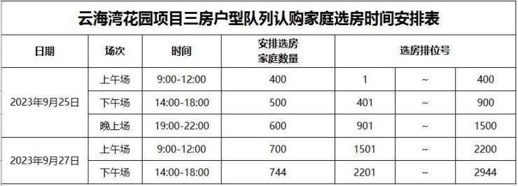 而根据前海管理局发布的云海湾花园三房户型选房时间安排表来看,上午场还有一半的选房家庭未开始选房。