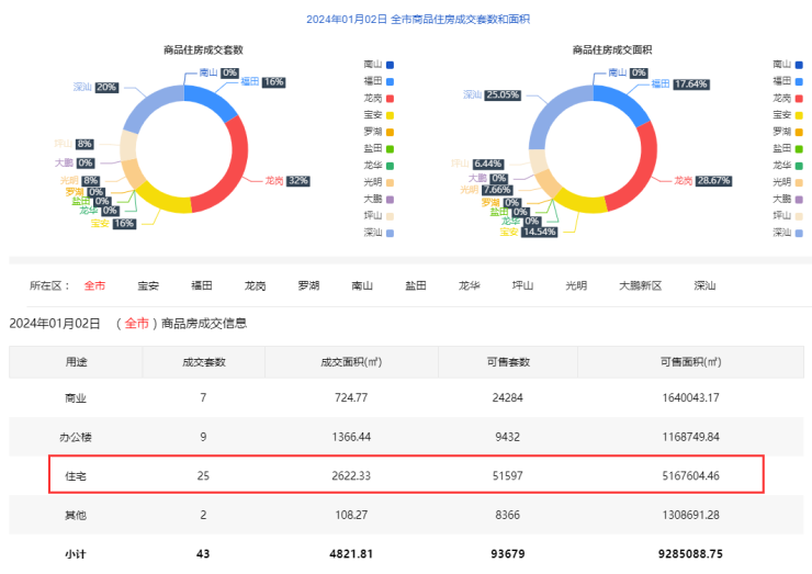 2024年1月2日新房住宅共网签25套。宝安4套;福田4套;龙岗8套;罗湖0套;南山0套;盐田0套;龙华0套;坪山2套;光明2套;大鹏0套;深汕5套。