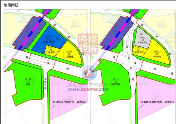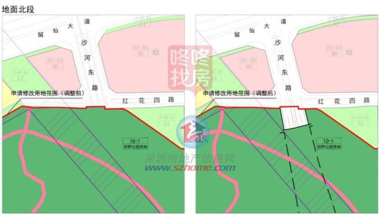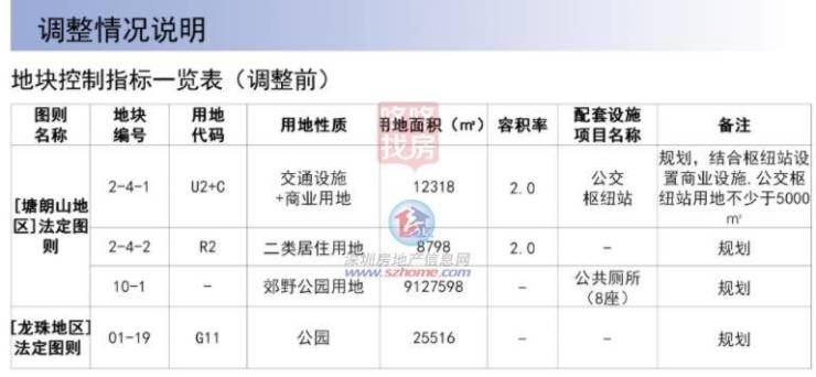 因为沙河东路北延项目,南山西丽塘朗山一宗交通设施+商业用地调整为发展备用地,面积也进行了缩小,同时临近的一块二类居住用地的面积扩大,由原来的8798平扩至9164.5平。