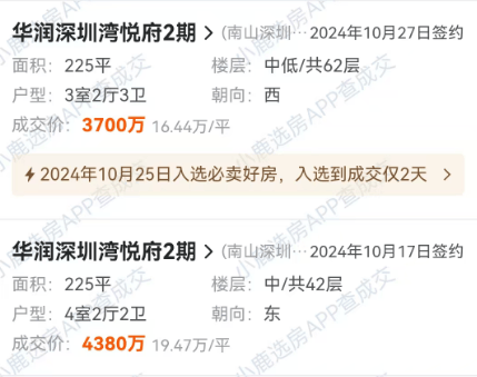 以同样面积225㎡的户型为例,该户型在2024年10月成交了两套房源,一套是中低楼层,朝西的户型,成交总价3700万;