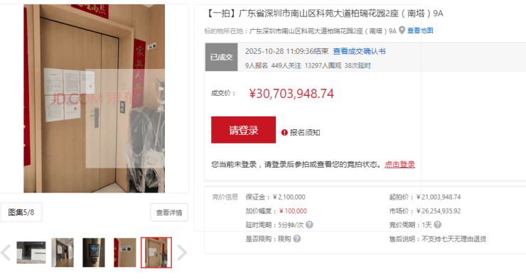 10月28日,柏瑞花园一套建面约225.88㎡的商品房住宅,以约3070万的总价,13.59万/㎡的单价,在京东平台成功拍出。