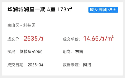 相同面积段的房源,在今年4月份二手房市场中,成交价大概是2535万,折合单价14.65万/㎡。