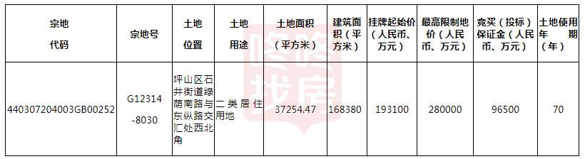 G12314-8030宗地位于,坪山区石井街道绿荫南路与东纵路交汇处西北角,土地面积37254.47㎡,挂牌起始价19.31亿。