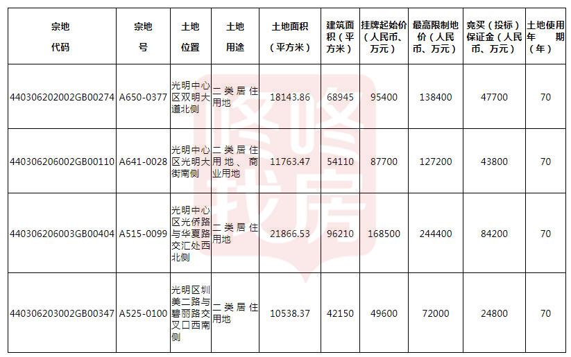 光明4宗地块,分别位于光明中心区双明大道北侧、光明中心区光明大街南侧、光明中心区光侨路与华夏路交汇处西北侧以及光明区圳美二路与碧丽路交叉口西南侧,挂牌起始价分别为9.54亿、8.77亿、16.85亿、4.96亿。