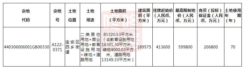 A122-0371宗地位于宝安区西乡街道,土地用途为二类居住用地+商业用地+教育设施用地+绿地+道路用地,土地面积,85320.53㎡(含教育设施用地16301.30㎡、绿地4000.03㎡、道路用地13149.33㎡),挂牌起始价41.36亿。