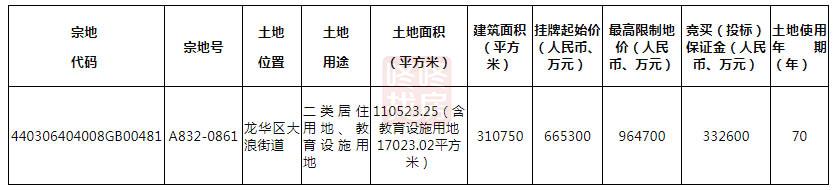 A832-0861宗地,位于龙华区大浪街道,土地用途为二类居住用地、教育设施用地,土地面积110523.25㎡(含教育设施用地17023.02㎡),挂牌起始价66.53亿。