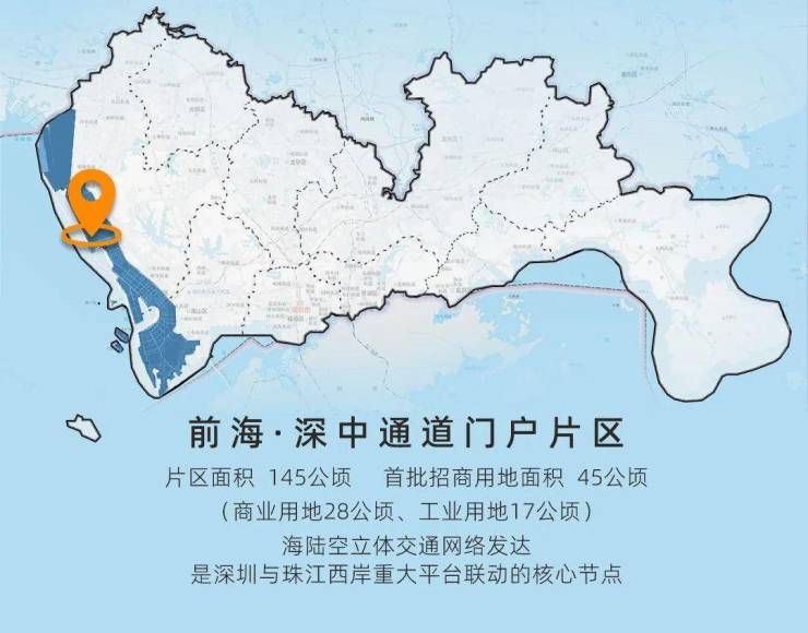 位于前海城市新中心,金融和总部企业集聚。片区面积85公顷,首批招商面积7公顷(其中商业用地7公顷)。