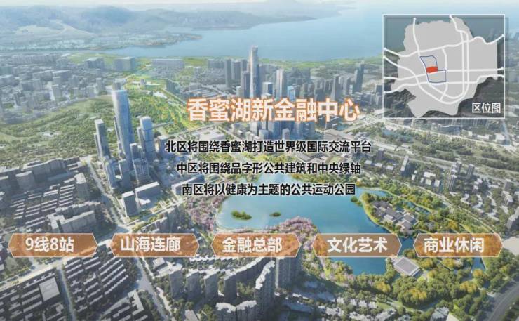 香蜜湖新金融中心,位于福田区西部,临近福田中心区,是湾区金融宝地、深圳金融主会场,可招商用地面积27公顷。