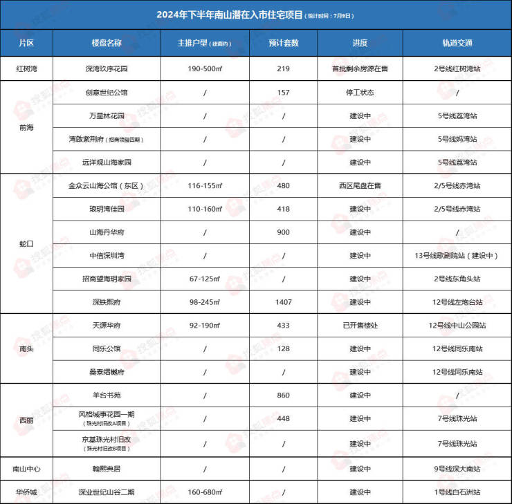 @搜狐焦点深圳 统计,南山下半年预计有19个新盘入市推售,其中前海、蛇口板块是主力供应区域,南头、西丽多个旧改项目或也有入市计划。