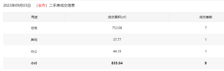 9月3日二手房住宅网签7套。宝安0套;福田3套;龙岗1套;罗湖2套;南山1套;盐田0套;龙华0套;光明0套;坪山0套;大鹏0套。