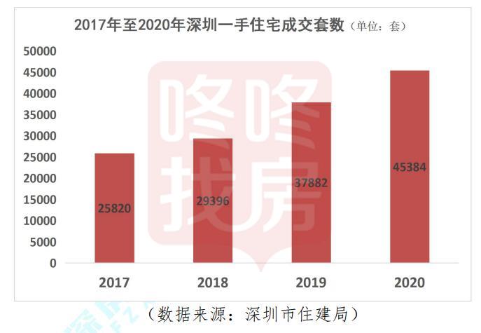 从一手房市场看,2020年一手住宅成交量创下近5年新高。2020年深圳新房市场供应活跃,引发市场持续的“打新热潮”。统计数据显示,2020年全年共成交45384套一手住宅,为自2016年以来的新高。