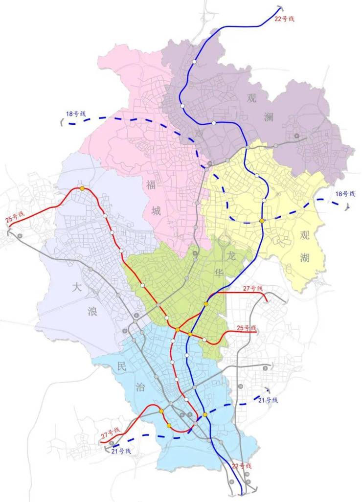 轨道22、25、27号线均被列入市轨道五期建设规划方案,龙华区新建轨道总里程数达46公里,在全市各区中名列第二。