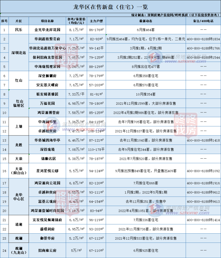 2022年龙华推出的新盘,多数新盘也有或多或少的房源仍在销售中;但是龙华新盘的去化周期在全市各区中应该总体算不错的,因为2021年推出的新盘中,已经有好几个相对热盘的房源基本售罄了,当然也有一些新盘还有货量。