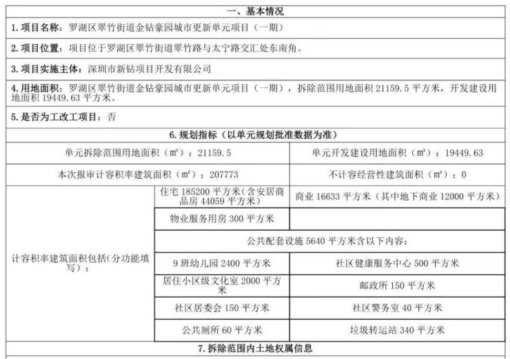 根据规划,金钻豪园项目分两期实施,其中一期拆除范围用地面积21159.5平方米,规划容积207773平方米。项目将建设住宅185200平方米(含安居商品房44059平方米)、商业16633平方米,并配建9班幼儿园、社区健康服务中心、文化室等公共配套设施。