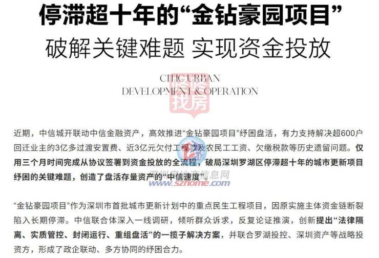 昨日,中信城开华南公众号发布了一篇”解锁纾困实践“的文章,表示中信城开联动中信金融资产,高效推进“金钻豪园项目”纾困盘活,有力支持解决超600户回迁业主的3亿多过渡安置费、近3亿元欠付工程款及农民工工资、欠缴税款等历史遗留问题。仅用三个月时间完成从协议签署到资金投放的全流程,破局深圳罗湖区停滞超十年的城市更新项目纾困的关键难题。