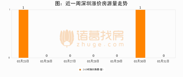 根据诸葛找房数据显示,深圳24小时涨价房源量为0套,较03月30日减少1套,环比下降100%。与此同时,涨价房源占比小幅回落,对于购房者来说是一个入市窗口期,购房者可抓住时机入市。