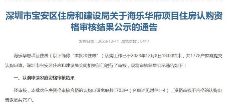 12月11日,深圳市宝安区住房和建设局发布了关于海乐华府项目住房认购资格审核结果。