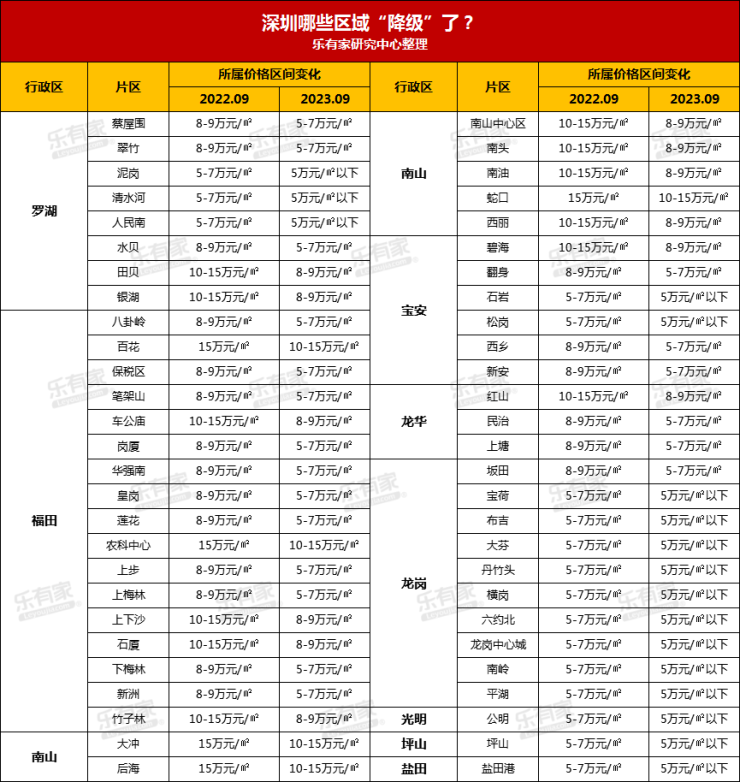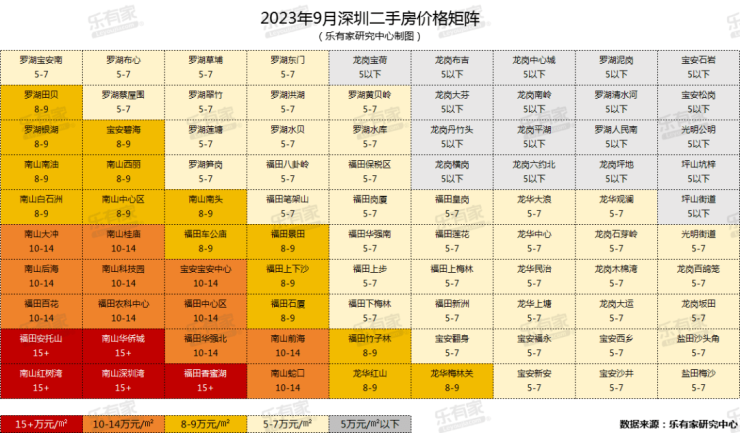 2022年10月,乐有家研究中心曾发布过一张深圳房价矩阵图,列举了各片区所属房价区间范围。