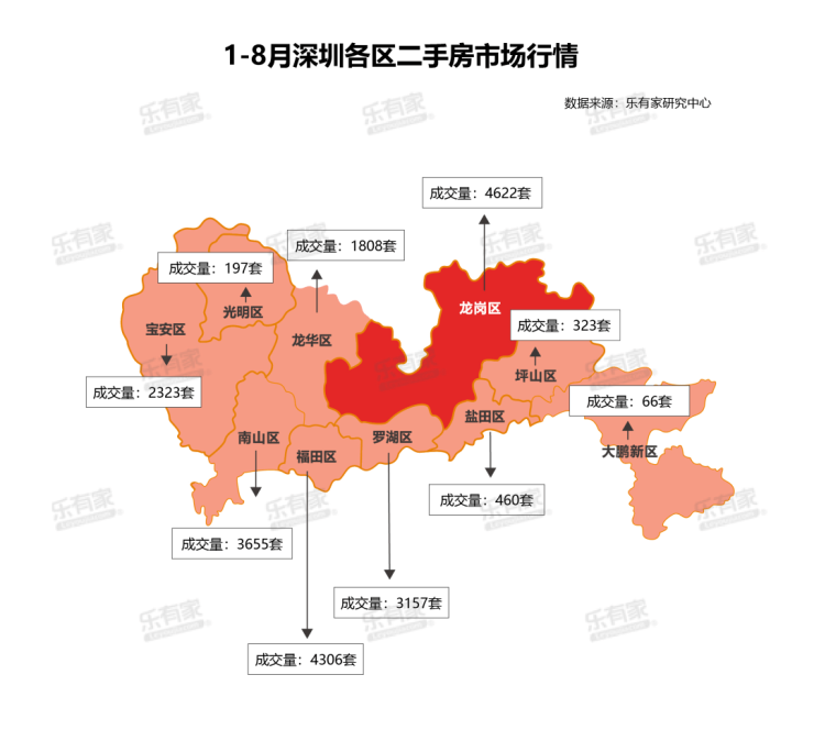 福田与龙岗是片区降级最多的行政区,当然它们的片区总数量也比较多。巧的是这两个区也是2023年1-8月成交二手房源最多的地区,房价的下滑吸引更多客户关注,也推动了市场交易的活跃。