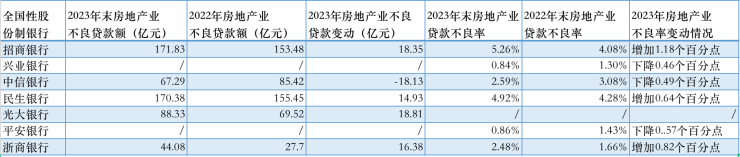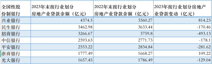 7家全国性股份行2023年房地产业贷款变动情况