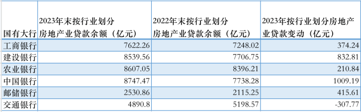 国有大行2023年房地产业贷款增减情况