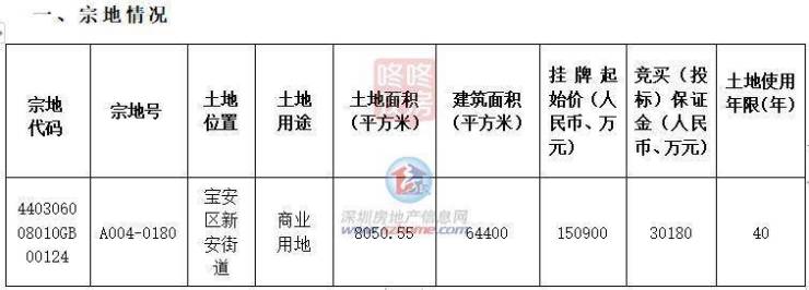 宗地A004-0180位于宝安新安街道,土地用途为商业用地,土地面积为8050平方米,建面64400平方米,挂牌起始价15.09亿,土地使用年限为70年。