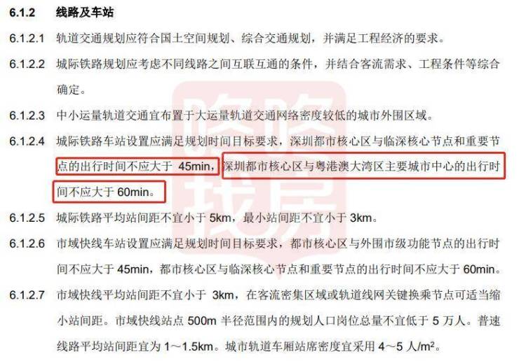 城际铁路车站及市域快线车站的设置应满足规划时间目标要求,深圳都市核心区与临深核心节点和重要节,以及都市核心区与外围市级功能节点的出行时间不应大于 45min,深圳都市核心区与粤港澳大湾区主要城市中心的出行时 间不应大于 60min。