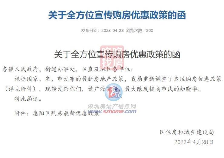 继多个城市放松楼市政策后,4月28日,惠州市惠阳区发布了《关于全方位宣传购房优惠政策的函》。