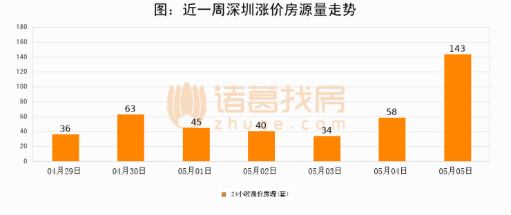 根据诸葛找房数据显示,深圳24小时涨价房源量为143套,较05月04日增加85套,环比上涨146.6%。与此同时,涨价房源占比小幅扩大,业主信心有所提升。